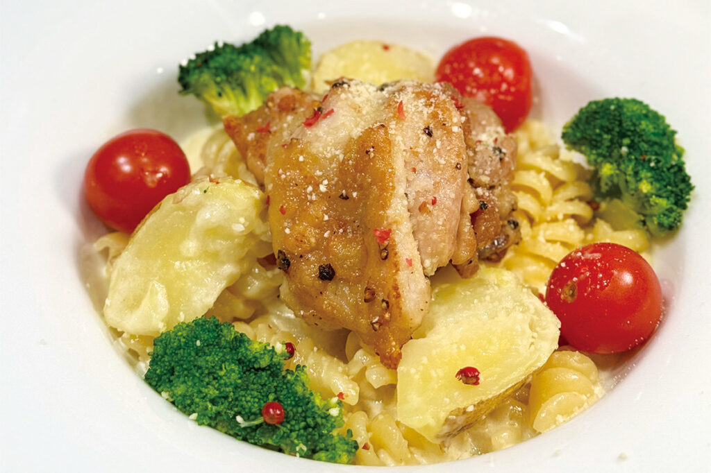 新ジャガとグリルチキンのあっさりクリームパスタ